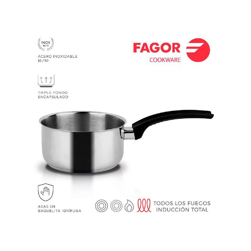 TACHO ALAIA Ø12CM INOX 18/10 FAGOR. FUNDO TERMODIFUSOR DE 3 CAMADAS (AÇO AISI 304+ALUMINIO 3003+AÇO AISI 430). TAMPA DE VIDRO TERMORESISTENTE COM BORDE EM INOX E SAÍDA DE VAPOR. CABO E ASAS ERGONÔMICAS DE BAQUELITA TERMO ISOLANTE. APTO PARA TODO O TIPO DE FOGOS. FAGOR