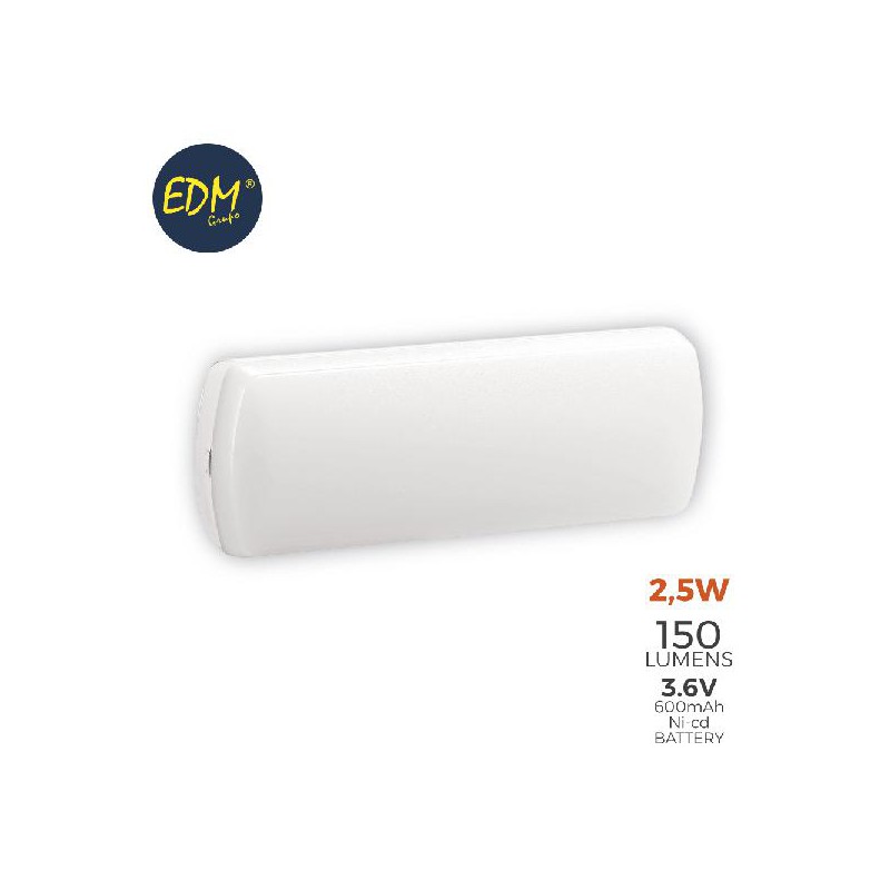 ARMADURA EMERGÊNCIA LED 150 LUMENS 2,5W - 5 LEDS DE 0,5W - MEDIDAS: 25,5X9X5CM EDM BATERIA DE 3,6V 600MAH NI-CD 220V EM ABS, SOBRECARGA E PROTEÇAO CONTRA LA DESCARGA EXCESSIVA. 2 HORAS DE AUTONOMIA. CLASSE II IP43 IK04 CUMPRE COM A NORMA CE