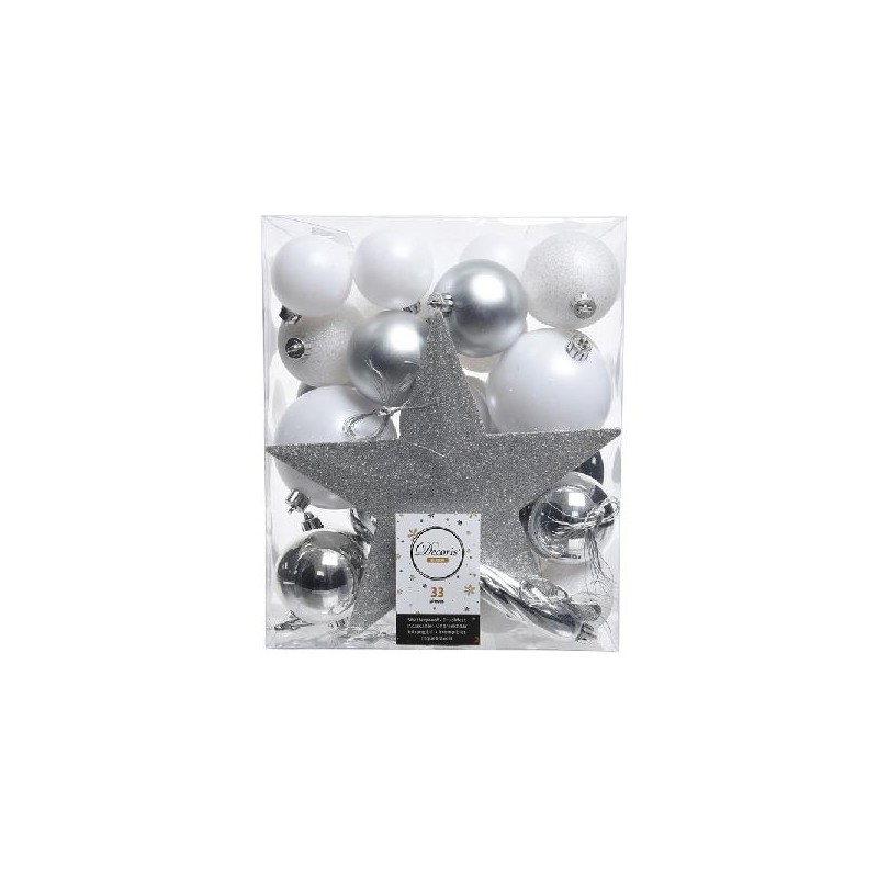 CAIXA DE 33 ACESSORIOS P/ARVORE PRATEADO E BRANCO