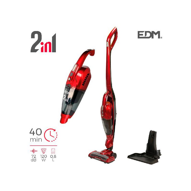 ASPIRADOR ESCOVA 2-EM-1 EDM SEM CABO 22.2V. MOTOR 120W 2200 MAH. 72DB DEPÓSITO 0.8L. LIMPADOR SEM FIO SEM CABO, COM LUZ LED NA BASE, PUNHO ERGONÔMICO, BASE DE CARGA PARA MELHOR APOIO E DUAS ESCOVAS PARA PEQUENOS ESPAÇOS. BATERIA 2.200MAH COM UM TEMPO DE CARREGAMENTO DE 4H E CAPACIDADE DE OPERAÇÃO DE 20/40 MINUTOS. CONTROLES DA VELOCIDADE DA SUCÇÃO EM TODOS OS TEMPOS E INDICADOR LED DE BATERIA FRACA. ACÚSTICAMENTE PROJETADO PARA ABSORVER VIBRAÇÕES E MANTER O SOM EM BAIXOS NÍVEIS. IDEAL PARA SOLOS E TAPETES. O LIMPADOR DE VÁCUO DE MÃO É ADEQUADO PARA VÁRIAS SUPERFÍCIES. A LIMPEZA FÁCIL DO DEPÓSITO OBRIGADO AO SEU SISTEMA DE ABERTURA PRÁTICA DE DEPÓSITO. CONTÉM DOIS ACESSÓRIOS: ESCOVA MACIA PARA A CABEÇA, UM CANTO E UM ACESSÓRIO MULTIFUNCIONAL. INCLUI O PONTO DE CARGA PRÁTICO PARA ARMAZENAMENTO.