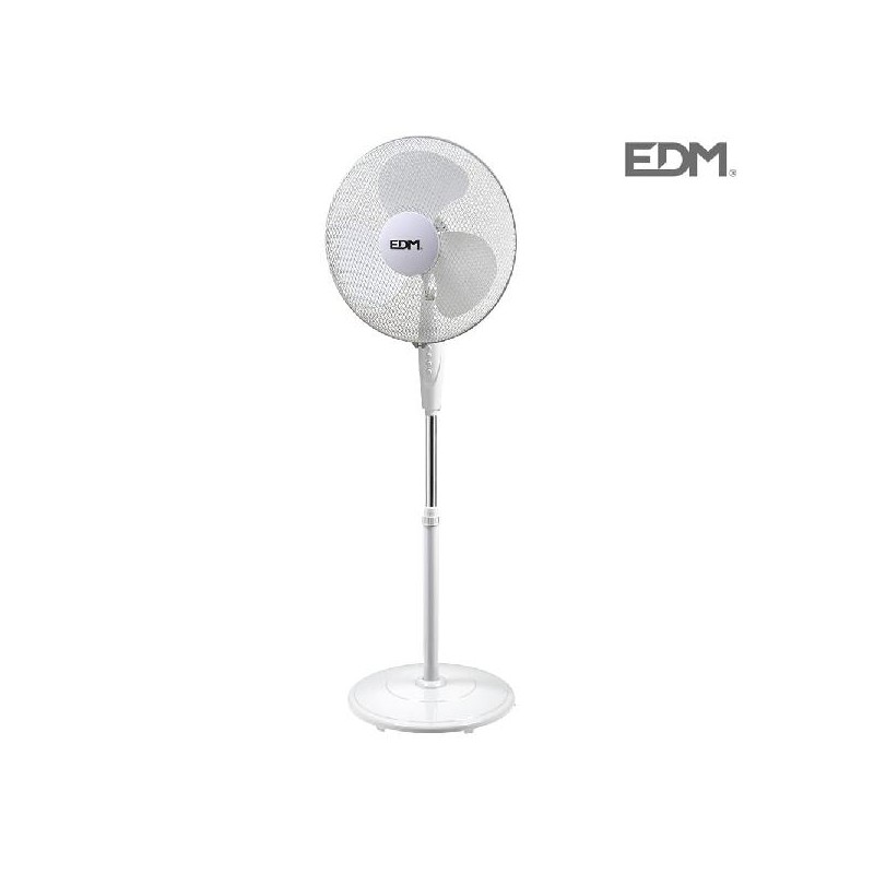 VENTOINHA DE PÉ COM BASE CIRCULAR BRANCO 45W Ø ASPAS 40CM ALTURA REGULÁVEL 110-130 CM 3 VELOCIDADES. MOVIMENTO OSCILANTE E ÂNGULO DE INCLINAÇÃO AJUSTÁVEL CAUDAL AR 3000M3/H 220/240V - 50HZ 3 PÁS EDM