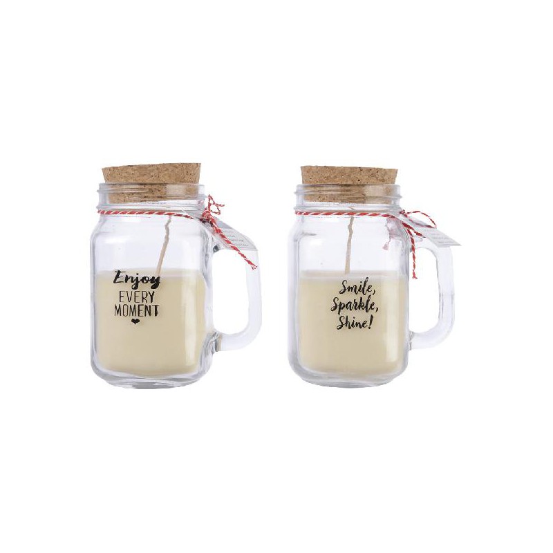 VELA PERFUMADA EM FRASCO 2 MODELOS SORTIDOS COM MENSAGEM (SMILE, SPARKLE, SHINE Y ENJOY EVERY MOMENT) 3% FRAGÂNCIA DE BAUNILHA 22 HORAS 150G 6X6X11,6CM