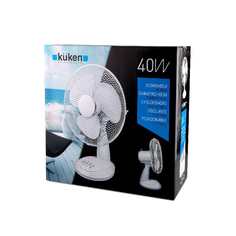 Composto por 3 lâminas de plástico de alta resistência. Seletor de ventilador de 3 velocidades. Cabeça ajustável verticalmente. Botão de rotação com alcance de 180º. Grade de segurança da lâmina.