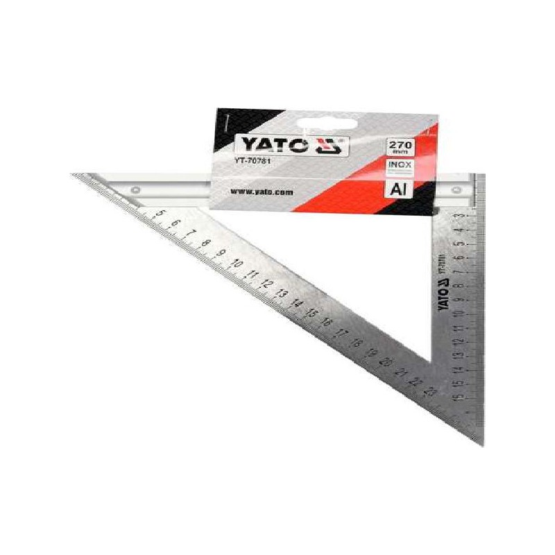Ângulo, quadrado de metal 270 mm com um pé. A base é feita de liga de alumínio, os braços são feitos de aço inoxidável. As bordas têm escala milimétrica permanente.