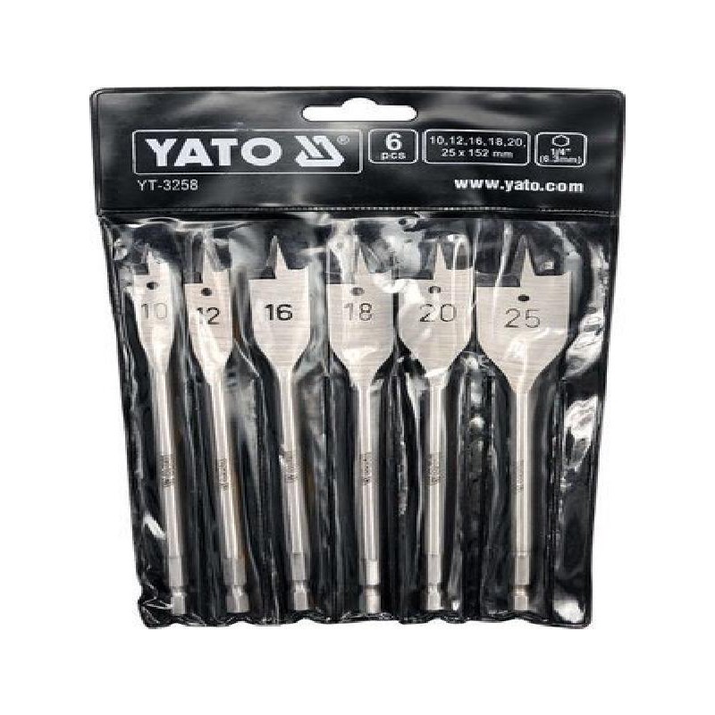 Conjunto de brocas com pá 6 peças Yato. Brocas profissionais em aço carbono temperado. Cabo hexagonal de 1/4 "para troca rápida da broca no mandril. Adequado para furar em madeira e tábuas de móveis.