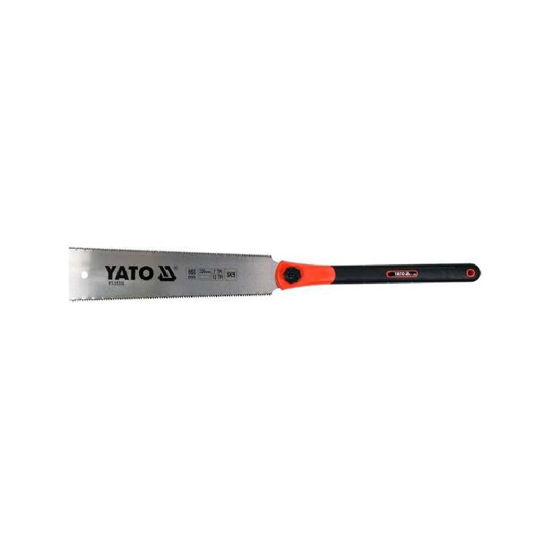 Serra manual de dois lados do tipo japonês (a chamada ryoba). Dentes endurecidos localizados em ambas as bordas da lâmina. A graduação de 7 tpi por um lado e 12 tpi por outro aumenta muito a usabilidade da serra. O comprimento de trabalho é de 320 mm e o comprimento total é de 660 mm. A lâmina de serra é fixada com um parafuso no cabo longo feito de plástico ABS com inserções TPR antiderrapantes e - dependendo das necessidades - pode ser ajustada em diferentes ângulos. Uma característica específica deste tipo de serra é a excepcional flexibilidade da lâmina em aço SK5 e a capacidade de cortar "na sua direção". Isso permite um corte eficiente ao longo ou transversalmente ao grão.