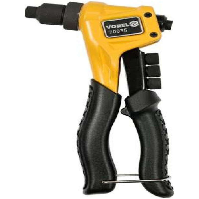 Rebitador manual Vorel 70035. Projetado para manusear rebites de aço, aço inoxidável e alumínio. Suporta rebites na faixa de: 2,4; 3,2; 4,0; 4,8 MM. As cabeças são feitas de aço ferramenta durável, CrMo de cromo-molibdênio. Alças revestidas com forro de borracha antiderrapante.