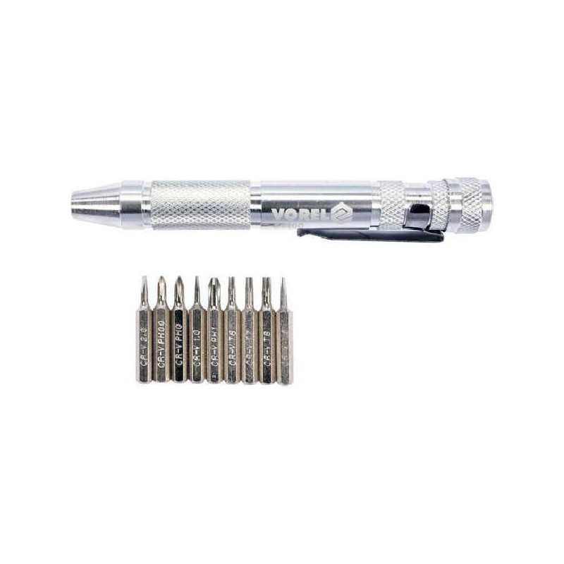 Um conjunto de brocas de precisão com uma chave de fenda Vorel 64400. Feito de ferramenta durável CrV cromo-vanádio aço.