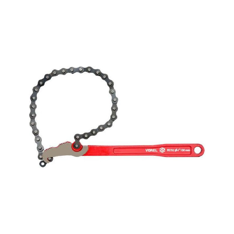 Descrição do Produto Chave de corrente para tubos com diâmetro máximo de 100mm (4 "). Corpo com 300mm de comprimento em aço forjado. Dentes endurecidos por indução. Corrente com 400mm de comprimento com possibilidade de ajuste livre do diâmetro