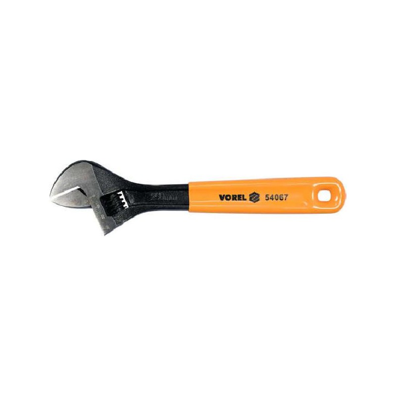 Chave ajustável 250 mm Vorel 54067. Fabricado em aço carbono, forjado. Superfície preta da chave. Cabeça de chave polida. Alça em uma bainha de borracha.