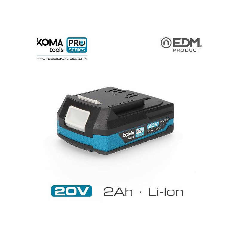 BATERIA LI-ON 20V 2,0 AH - COM INDICADOR DE CARGA - TEMPO DE CARGA 30 MINUTOS COM REFERÊNCIA DO CARREGADOR 125W 08773 E 60 MINUTOS COM REFERÊNCIA DO CARREGADOR 60W 08772 - DIMENSÕES: 11,7 X 7,5 X 6,3 CM - TOTALMENTE COMPATÍVEL ENTRE TODA A GAMA DE FERRAMENTAS KOMA - EDM