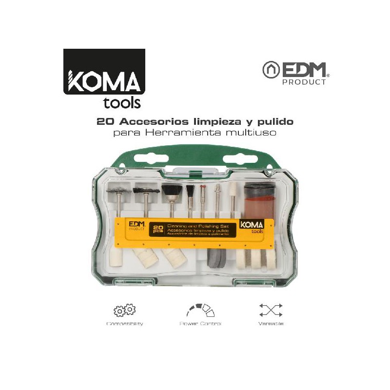 SET 20 ACESSORIOS KOMA TOOLS PARA 08709 EDM.SET DE LIMPEZA E POLIDO DE 20 PEÇAS: MANDRIL 1 PÇ PARA RODA DE CORTE: DIAM. 3.2MM MANDRIL 1 PEÇA PARA RODAS DE FILTRO DIAM. 3.2MM. ESCOVA 4 PÇ: DIAM. 3.2MM RODAS DE FELTRO 3 PÇ:25X6.3MM RODAS DO FELTRO 6 PÇ: 12.7X6.3MM 2 PEÇAS 2 PEÇAS RODA DE ESMERIL DE BORRACHA:22X3MM. COMPOSTO DE PULIDOR 1 PÇ. 1PÇ RODA DE FELTRO PONTIAGUDA. RODA DE POLIDO 1 PÇ: DIAM.3.2MM MEDIDA DA CAIXA 17.3X12.5X4.1CM