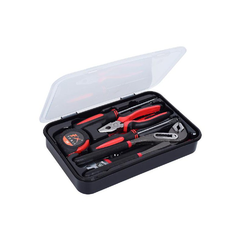 SET DE FERRAMENTAS DE 9 PEÇAS, JOGO DE FERRAMENTAS COMBINADAS DE 9 PEÇAS DE FERRO FUNDIDO, JOGO SUBMINISTRADO EM ESTOJO DE PP. 1 ALICATE COMBINADO DE 6¨ / 150MM, 1 CHAVE DE AJUSTE DE 8¨ / 200MM, 1 BOMA DE ÁGUA DE 10¨ / 245MM, 1 CORTADOR DE PLÁSTICO DE 18MM, 1 CHAVE DE FENDA -6 100 MM, 2 CHAVES DE PRECISÃO, 1 FITA MÉTRICA DE 3M