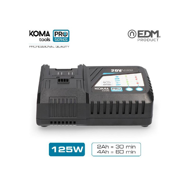 CARREGADOR RAPIDO BATERIA 125W KOMA TOOLS BATTERY SERIES EDM 100-240V CARREGADOR 2.3A-5A TEMPO DE CARGA 30 MINUTOS PARA BATERIA 08770 2.0AH 60 MINUTOS PARA BATERIA 08771 4.0AH