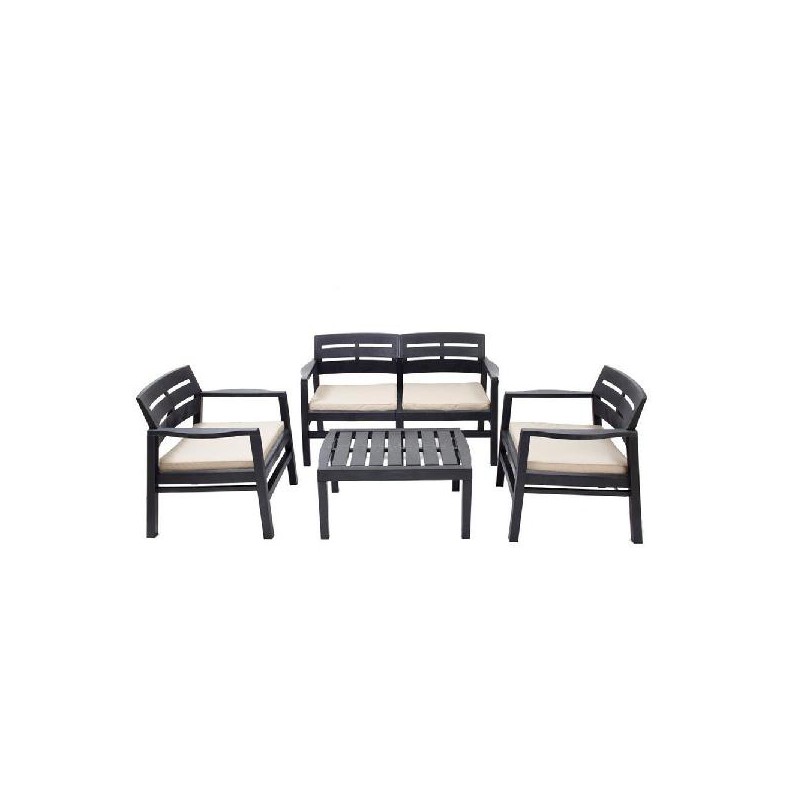 CONJUNTO DE RESINA PARA SALA PARA INTERIOR E EXTERIOR: 2 CADEIRÕES, 1 SOFA DE 2 LUGARES E MESINHA. INCLUI ALMOFADAS. CADEIRÃO 72,5X65X74,5CM SOFA 133X65X74,5CM MESINHA 78X55X38CM IPAE PRO GARDEN