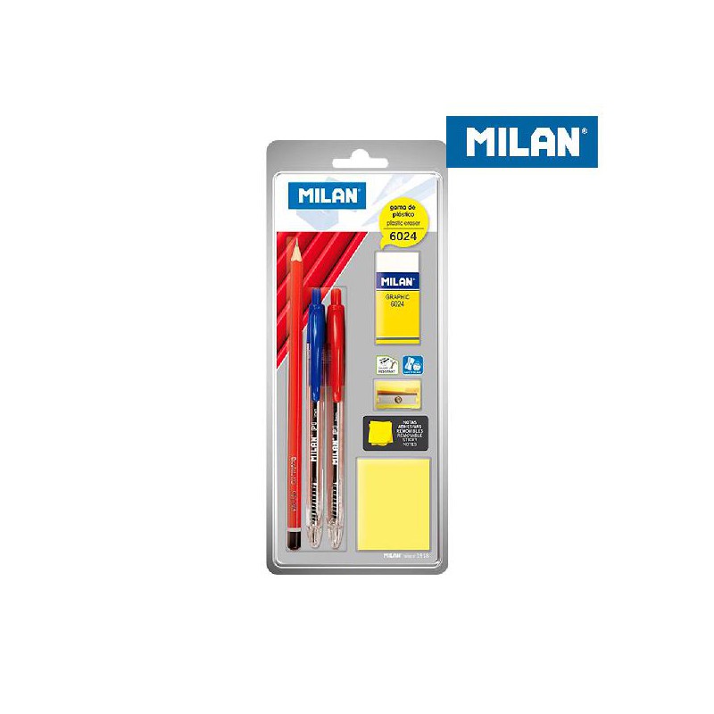BLISTER 2 CANETAS, LÁPIS GRAFITE, BORRACHA, AFIA E NOTAS ADESIVAS MILAN. INCLUI: 1 LÁPIS DE GRAFITE HB HEXAGONAL, 1 CANETA P1 AZUL E UMA CANETA P1 VERMELHO; 1 BORRACHA GRAPHIC 6024: BORRACHA DE PLÁSTICO BRANCA, PARA APAGAR LÁPIS SOBRE TODO O TIPO DE SUPERFÍCIES, COM FAIXA DE PAPELÃO AMARELA E EMBRULHADA INDIVIDUALMENTE; 1 AFIA SQUARE; 1 BLOC 100 NOTAS ADESIVAS AMARELAS 50 X 38 MM.
